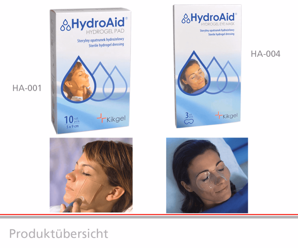 HydroAid ist eine sterile und transparente Auflage aus Hydrogel zum Einsatz in der Lasertherapie, der ästhetischen Medizin und der plastischen Chirurgie. Die spezielle Netzstruktur aus drei Polymeren mit einem Wasseranteil von mehr als 90 Prozent macht das drei Millimeter dicke Gelpad besonders homogen, elastisch und mechanisch belastbar.